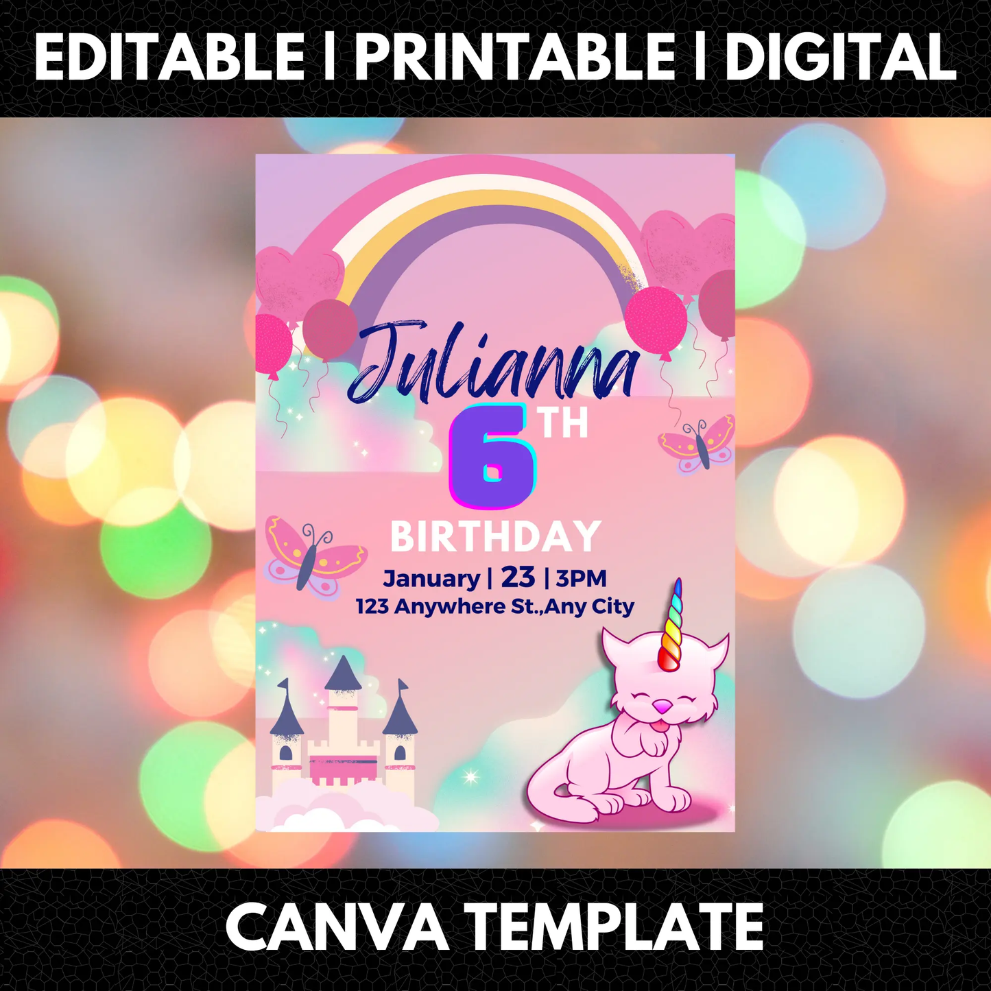Welcome to CreativeRino, your go-to source for unique and customizable party invitations! Our Editable Digital Printable Caticorn Birthday Invitation Canva Template is the perfect way to add a personal touch to your Birthday Party Celebrations.