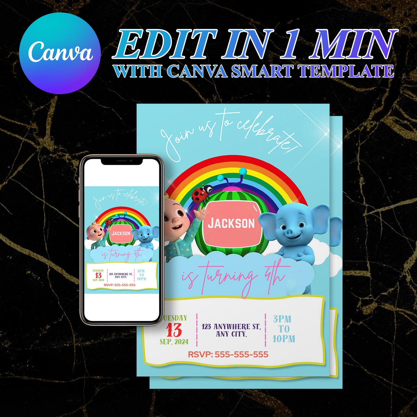 Welcome to CreativeRino, your go-to source for unique and customizable party invitations! Our Editable Digital Printable Cocomelon Birthday Invitation Canva Template is the perfect way to add a personal touch to your Birthday Party Celebrations.