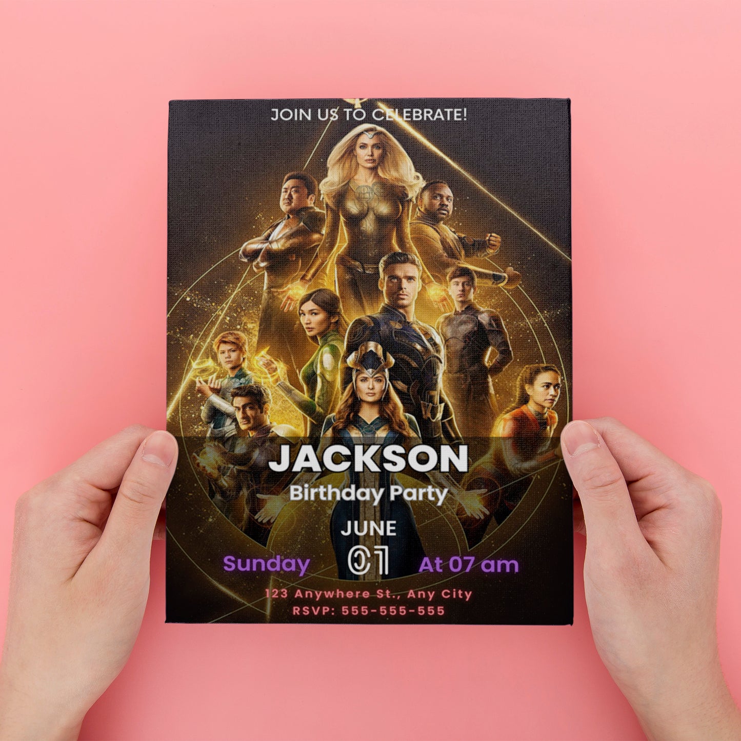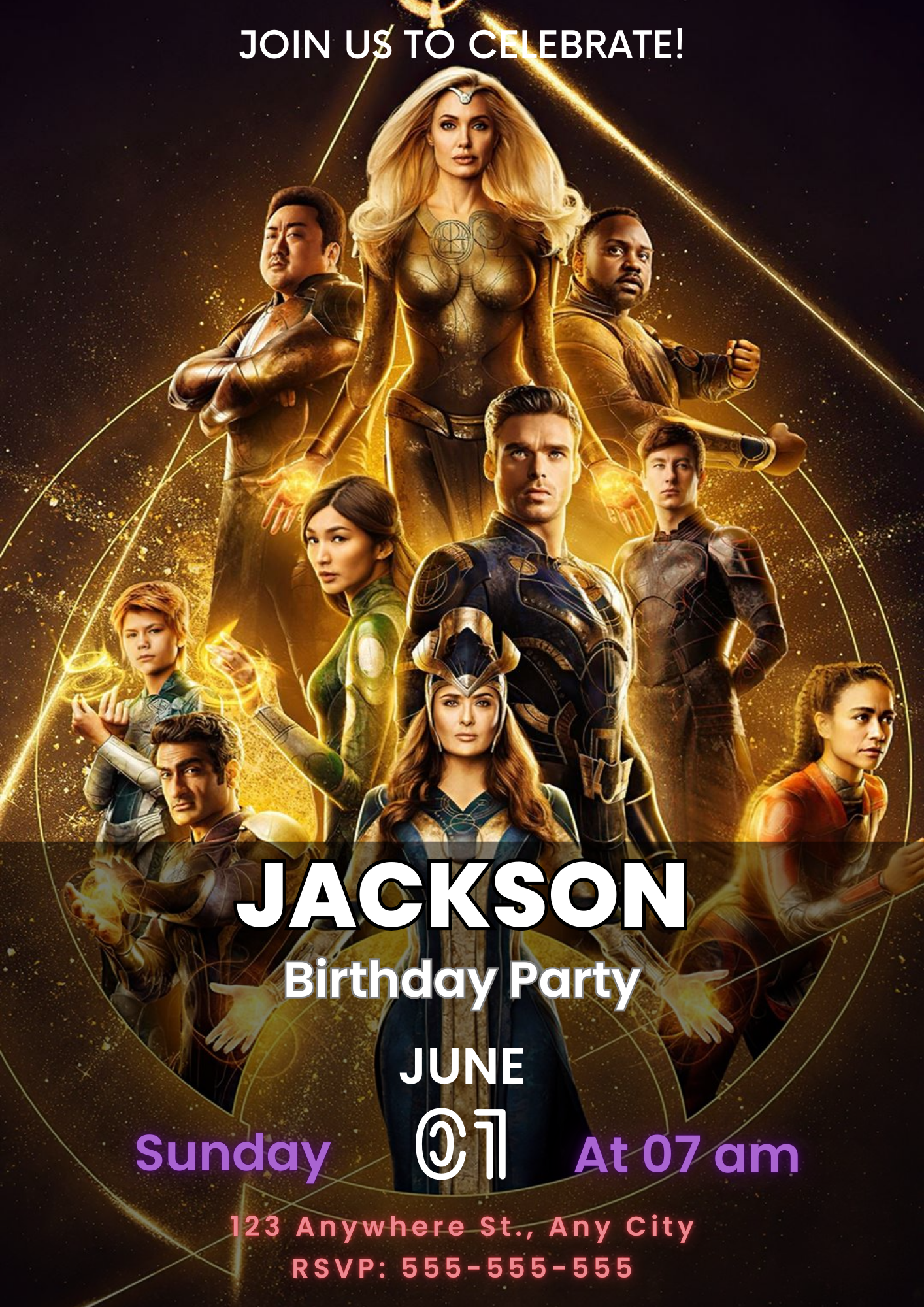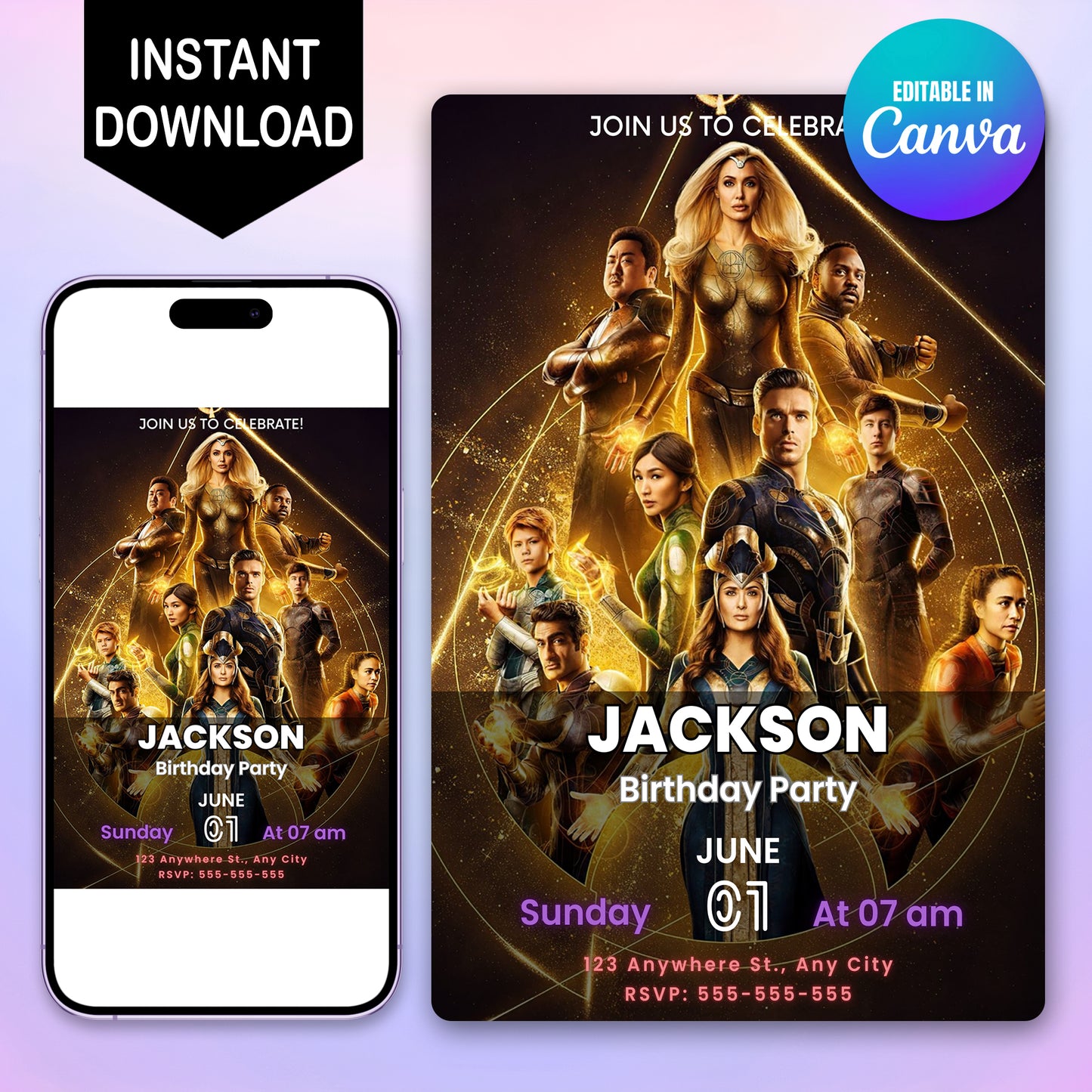 elebrate like a celestial being with this Eternals Birthday Invitation Canva Template! Whether you're throwing a Eternals birthday party for a Marvel fan or honoring one of the Eternals character birthdays, this invitation sets the stage for an unforgettable cosmic celebration.