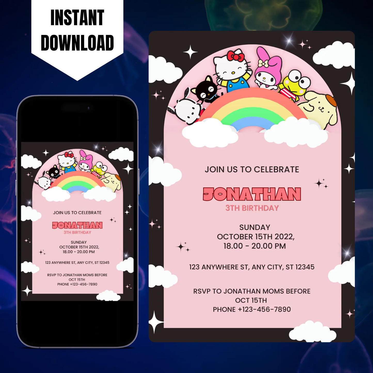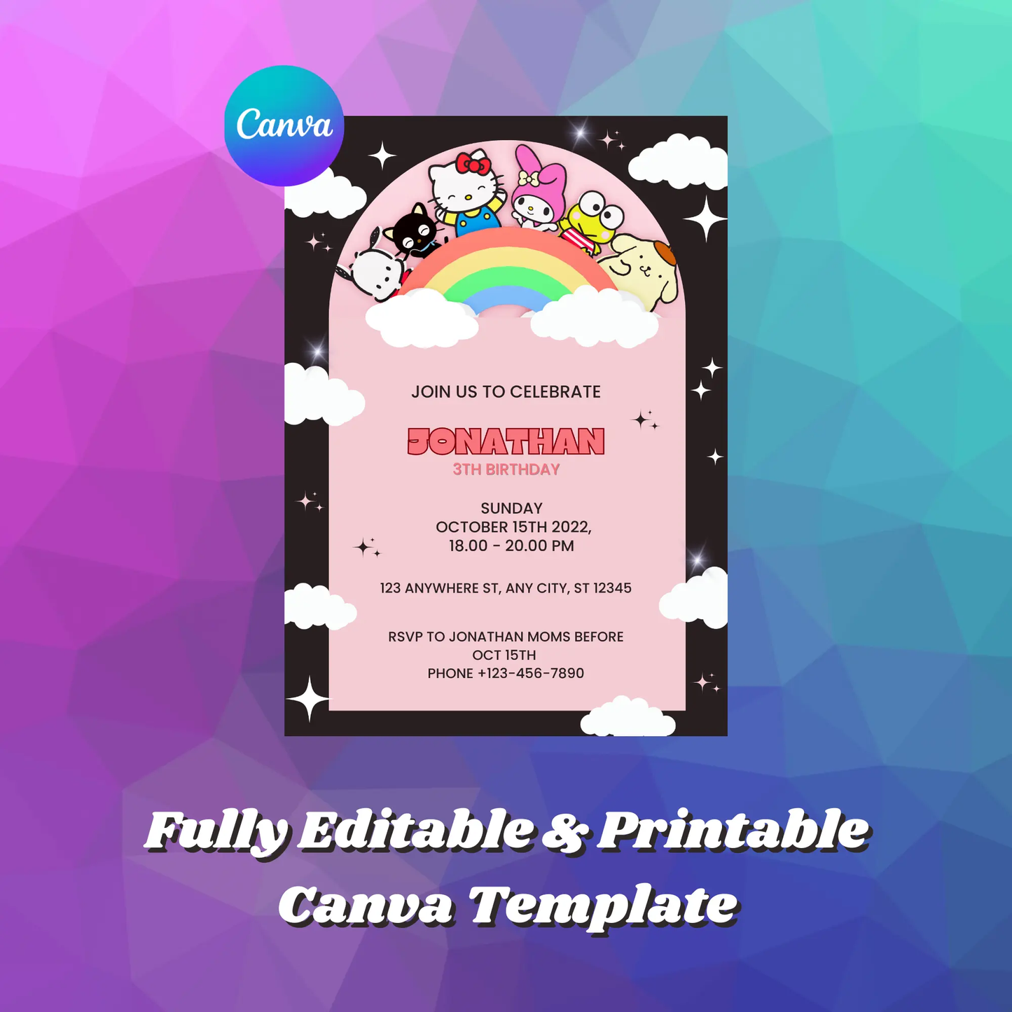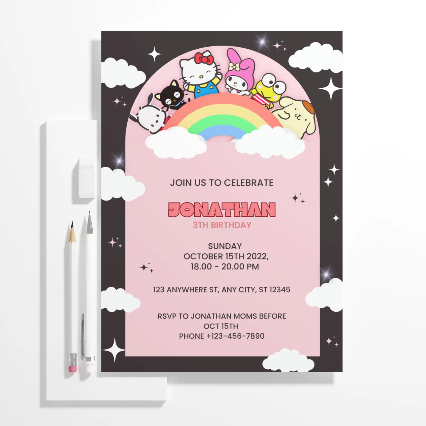 Welcome to CreativeRino, your go-to source for unique and customizable party invitations! Our Editable Digital Printable Kawaii Kitty Birthday Invitation Canva Template is the perfect way to add a personal touch to your Birthday Party Celebrations.