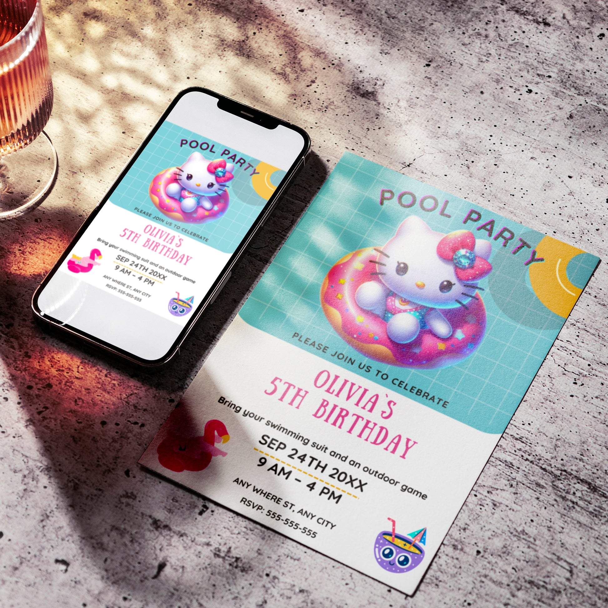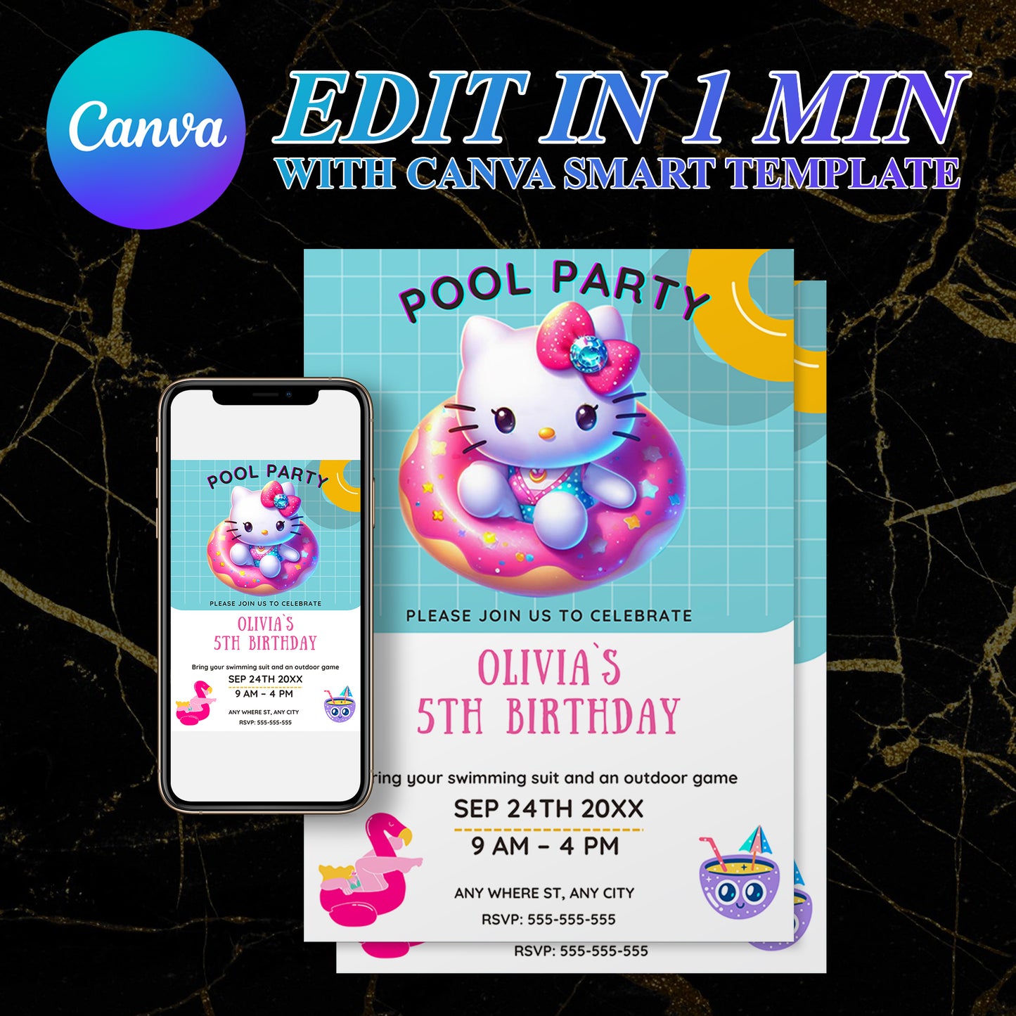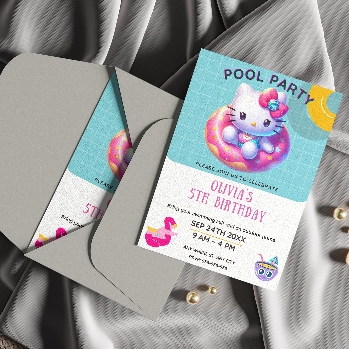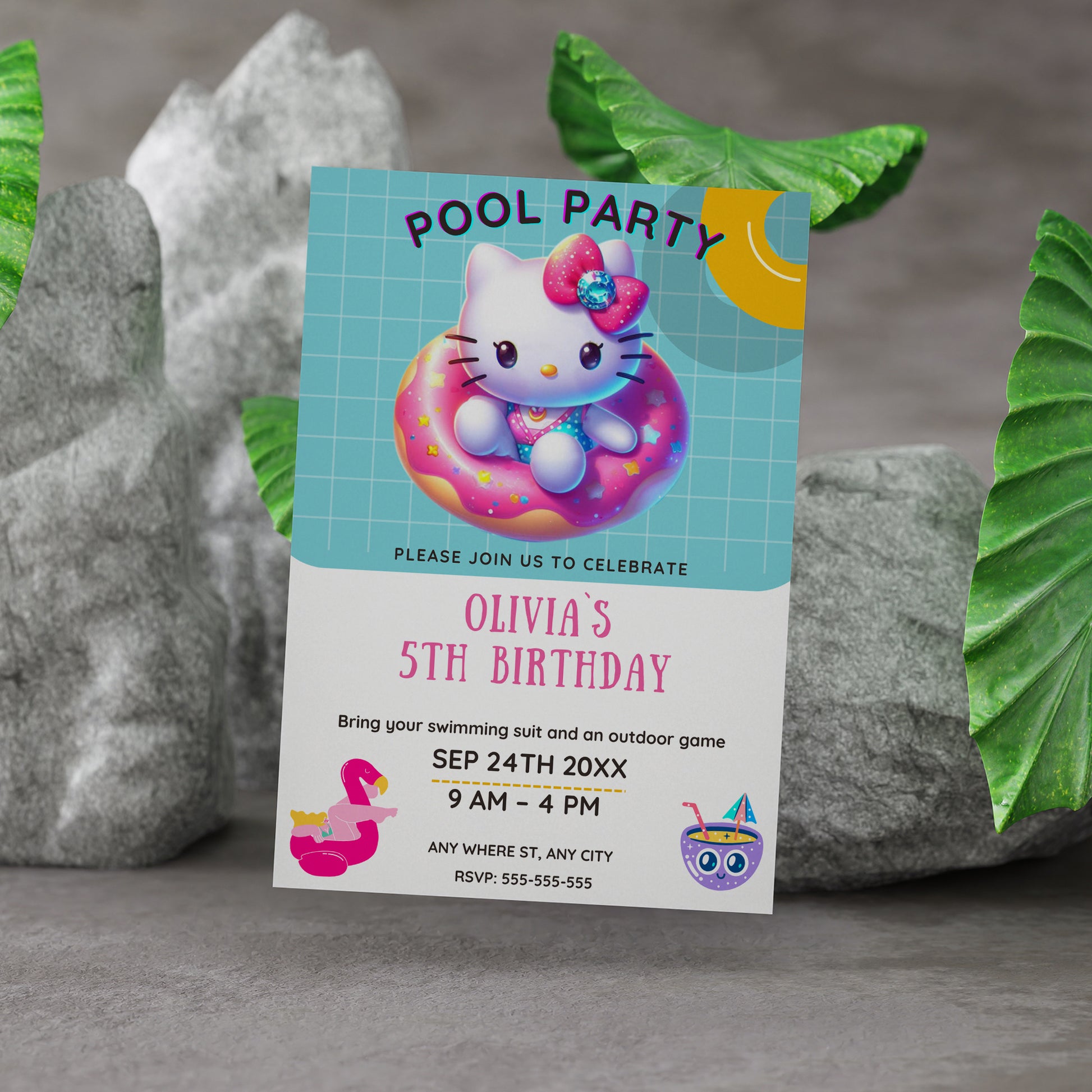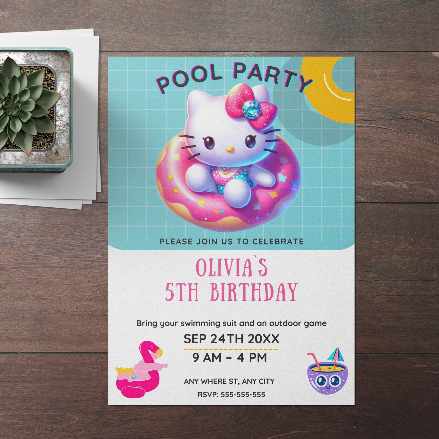 Welcome to CreativeRino, your go-to source for unique and customizable party invitations! Our Editable Digital Printable Kawaii Kitty Pool Birthday Party Invitation Canva Template is the perfect way to add a personal touch to your Birthday Party Celebrations.