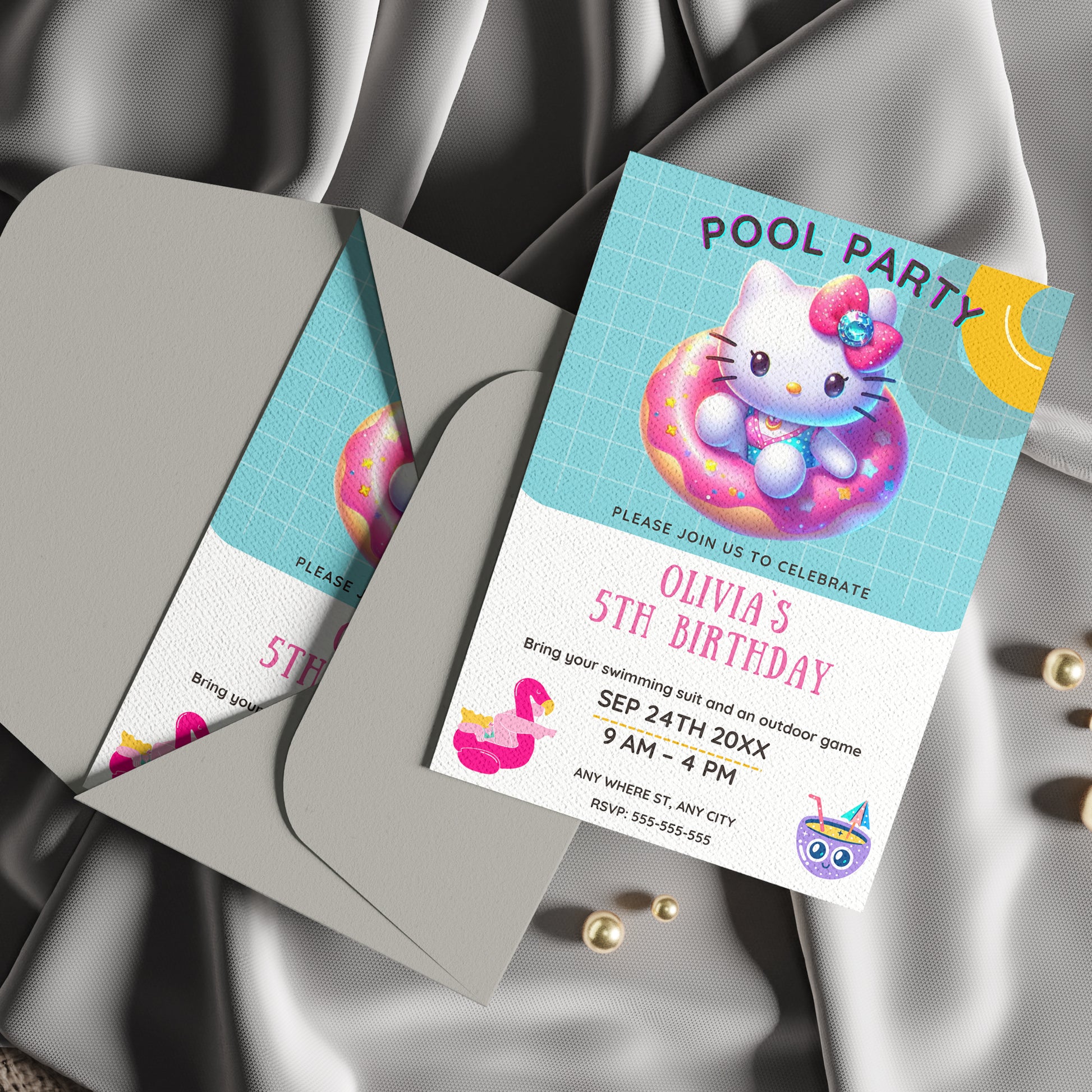 Kawaii Kitty Pool Birthday Party Invitation Template