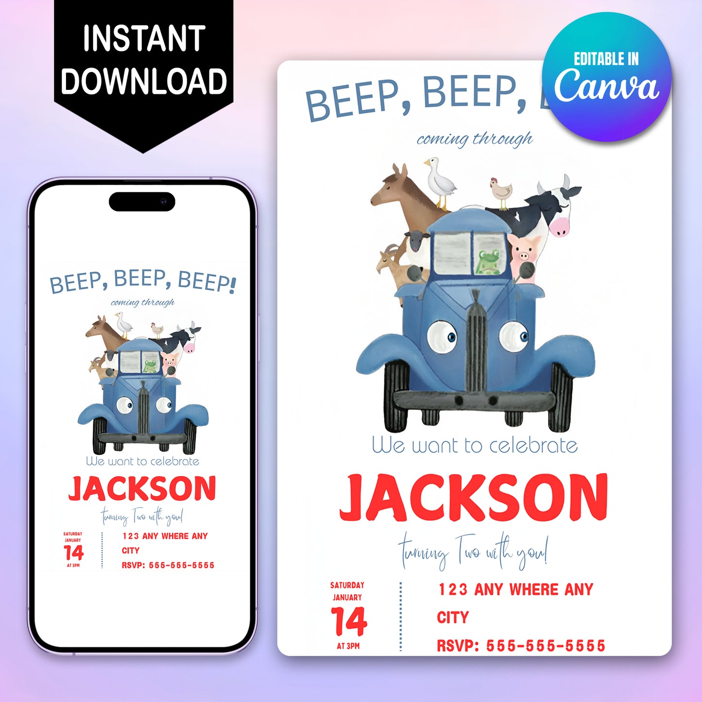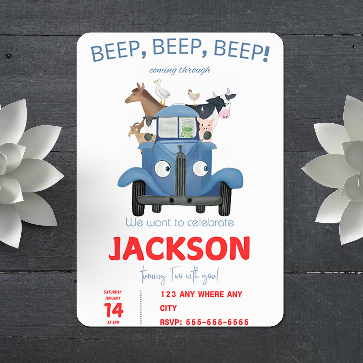 Beep! Beep! Get ready for a fun-filled Little Blue Truck birthday party with this adorable and fully customizable Little Blue Truck birthday invitation! Perfect for little truck lovers, this Little Blue Truck birthday card will set the tone for a joyful celebration full of adventure and farmyard fun.