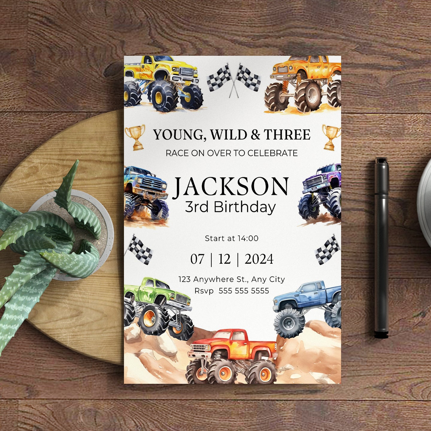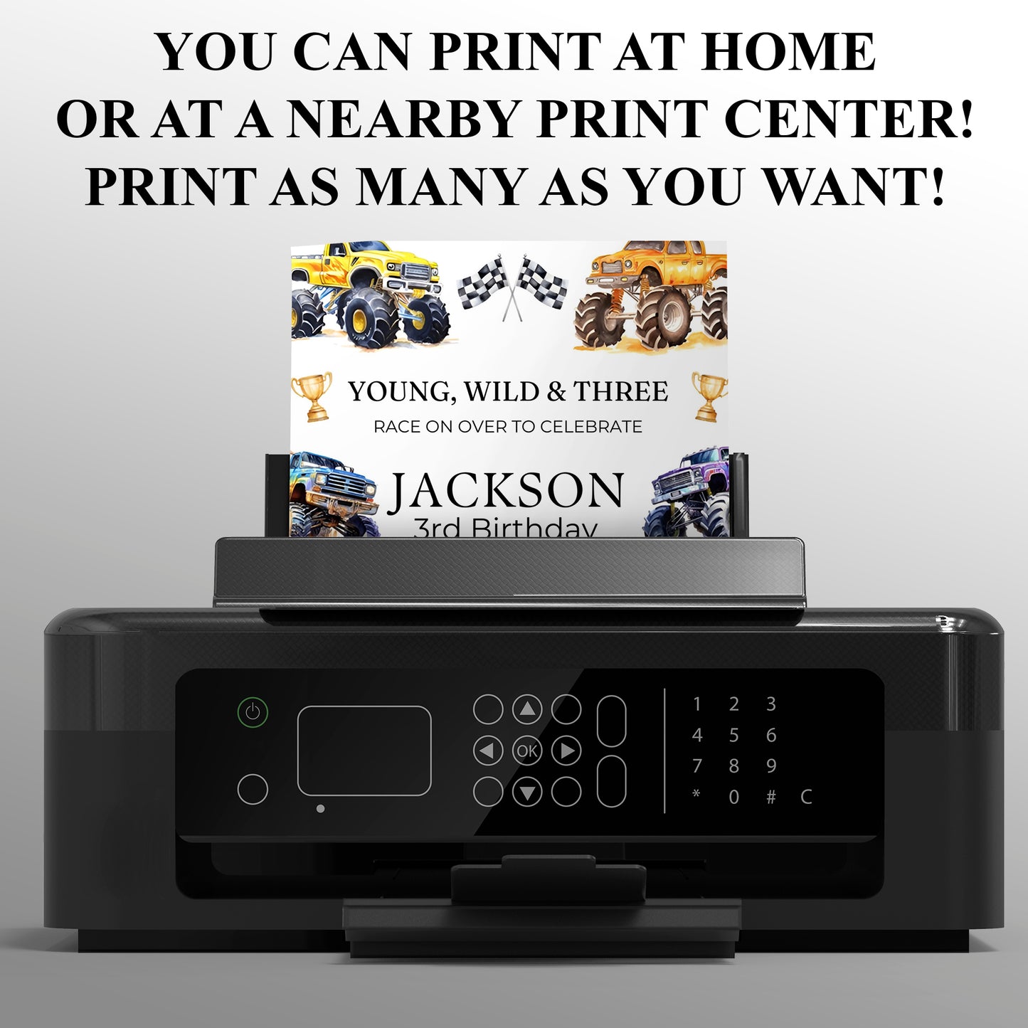 ✔ Print or Send Digitally – Easily print at home or send your Monster Truck invitation online.