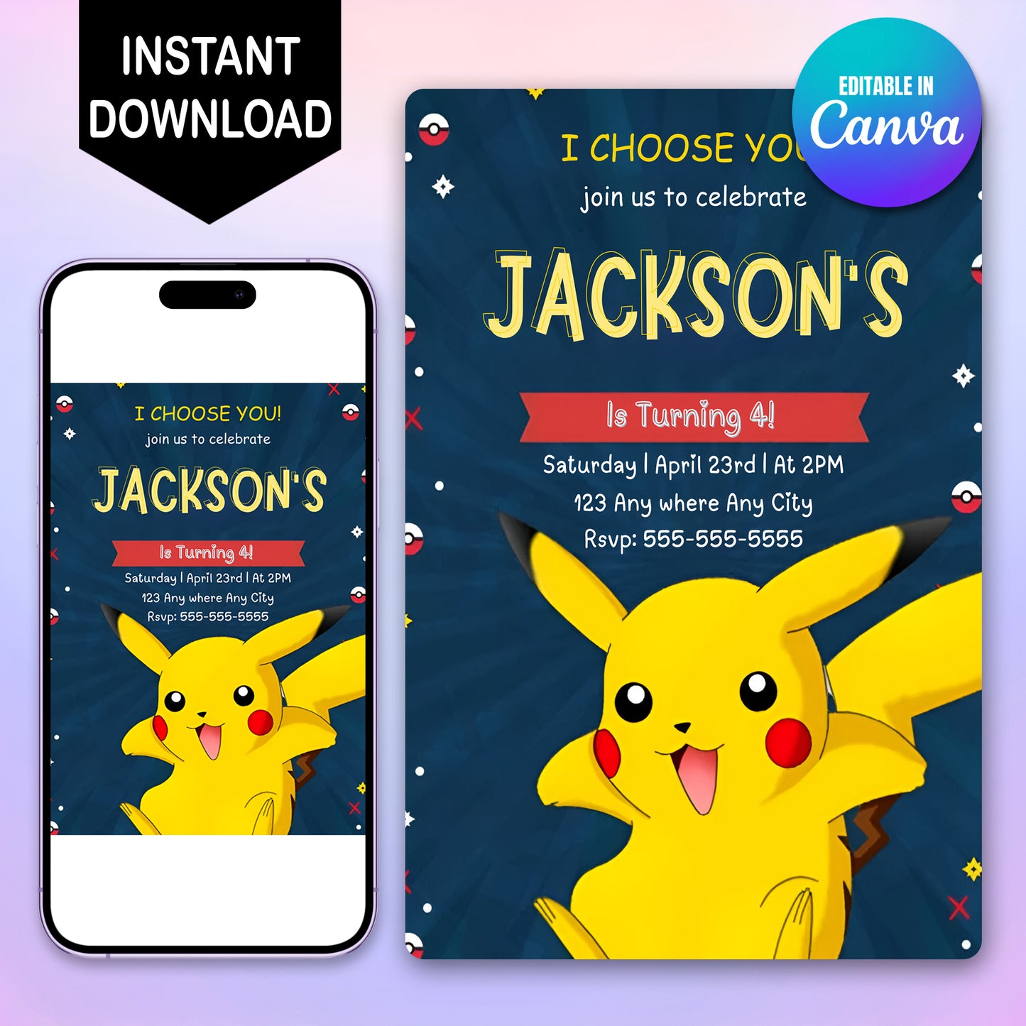 ✔ Fully Editable in Canva – Personalize your Pokémon birthday invitation in just minutes—change the text, colors, and details effortlessly!
