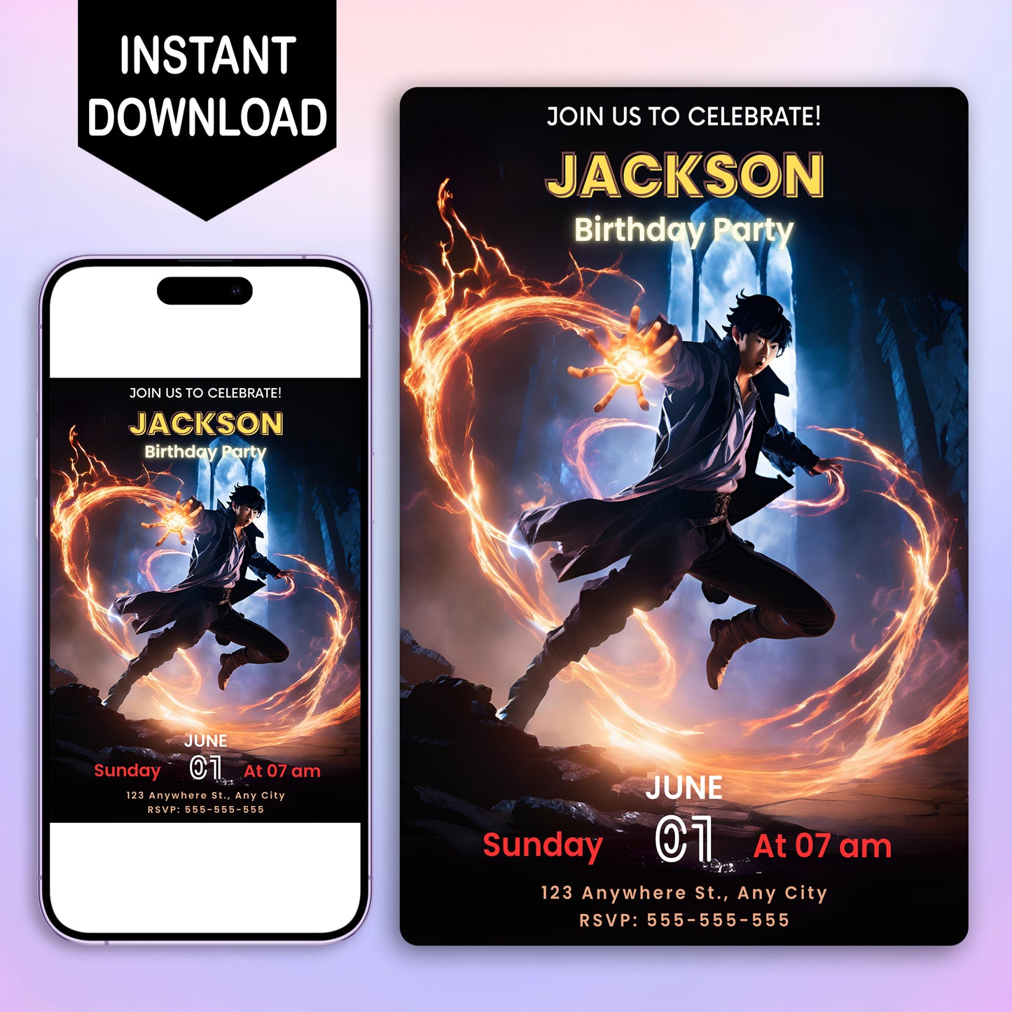 Step into the world of hunters and dungeons with this Solo Leveling Birthday Invitation Canva Template! Whether you're celebrating your special day or honoring Solo Leveling character birthdays, this invitation is the perfect way to gather your party for an epic event. Inspired by the dark fantasy and action-packed world of Solo Leveling, this Solo Leveling invitation will set the stage for an unforgettable adventure!
